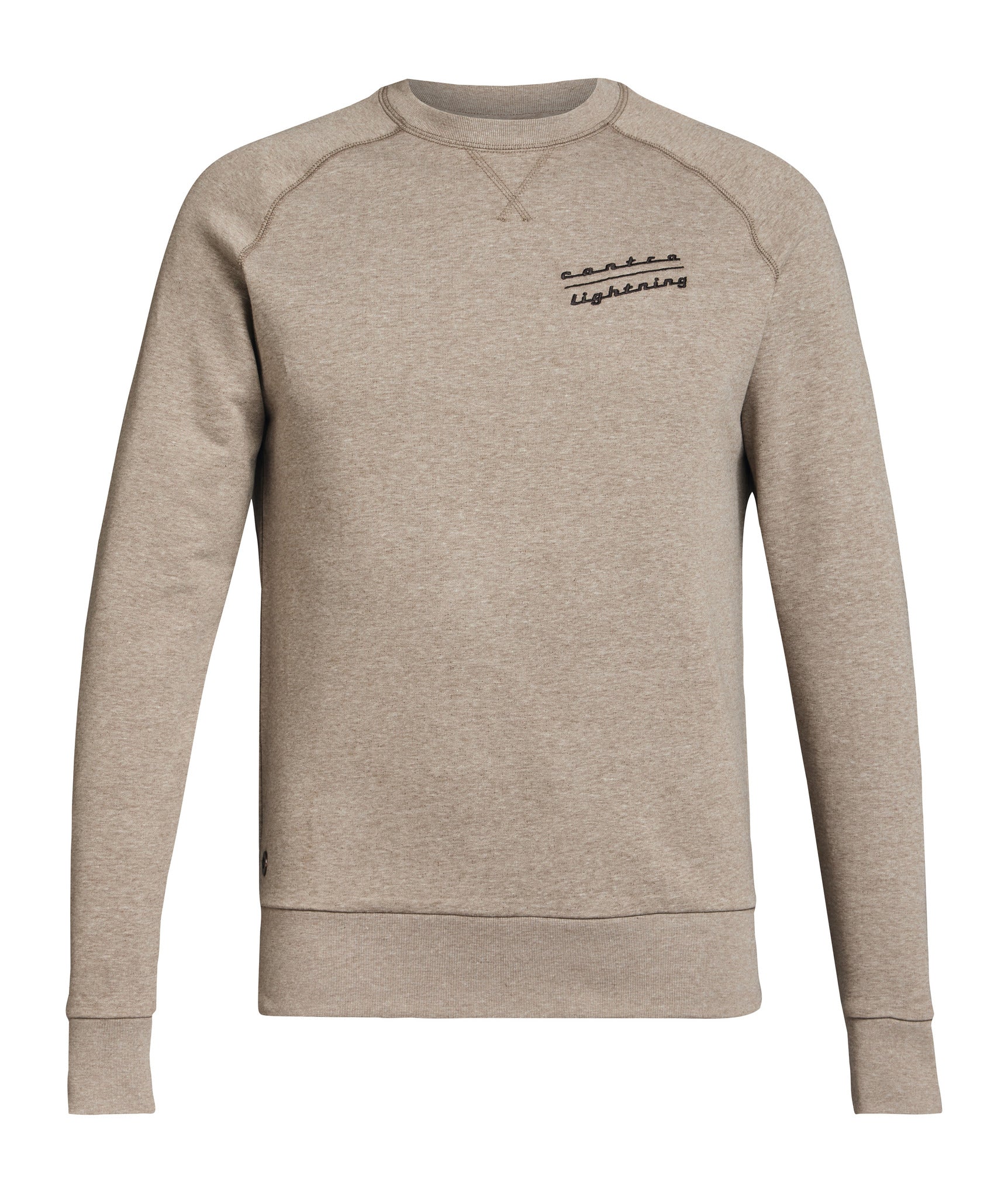 Sweat-shirt beige très léger pour homme. Les manches sont de style raglan et s'étendent jusqu'à la zone des épaules avec des coutures décoratives qui courent en diagonale jusqu'à la zone du col.